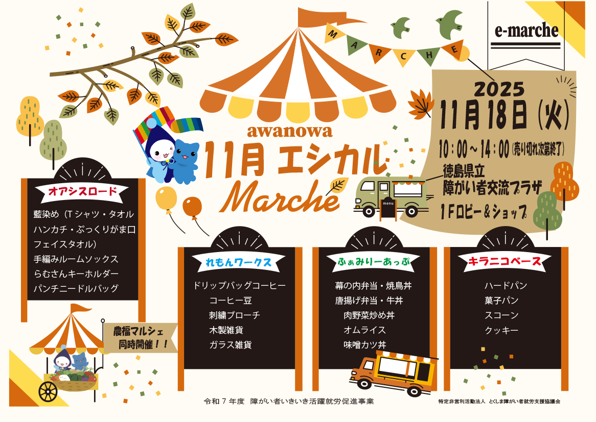 awanowaエシカルマルシェ11月 2025年11月12日 最終更新日時 : 2025年11月12日 arunjo_user ~awanowaエシカルマルシェ11月~ 日時 2025年11月18日(火) 10:00~14:00 場所 徳島県立障がい者交流プラザ1F ロビー&ショップ ≪参加施設》 ・キラニコベース ・オアシスロード ・ふぁみりーあっぷ ・れもんワークス
